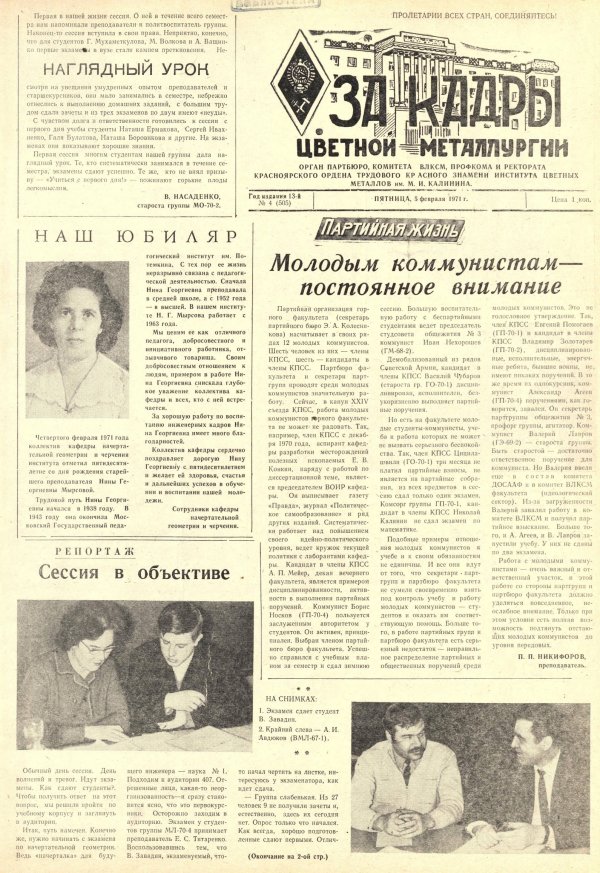 За кадры цветной металлургии : газета. 1971 г. № 4 (505) (5 февраля)выпуск журнала/газеты