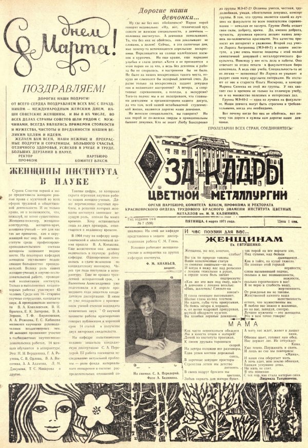 За кадры цветной металлургии : газета. 1971 г. № 7 (508) (4 марта)выпуск журнала/газеты
