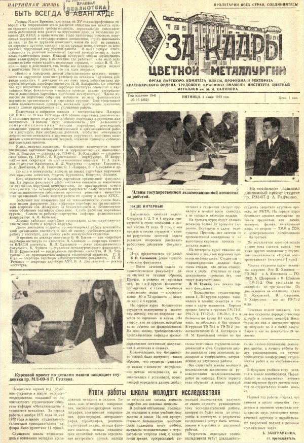 За кадры цветной металлургии : газета. 1972 г. № 16 (462) (2 июня)выпуск журнала/газеты