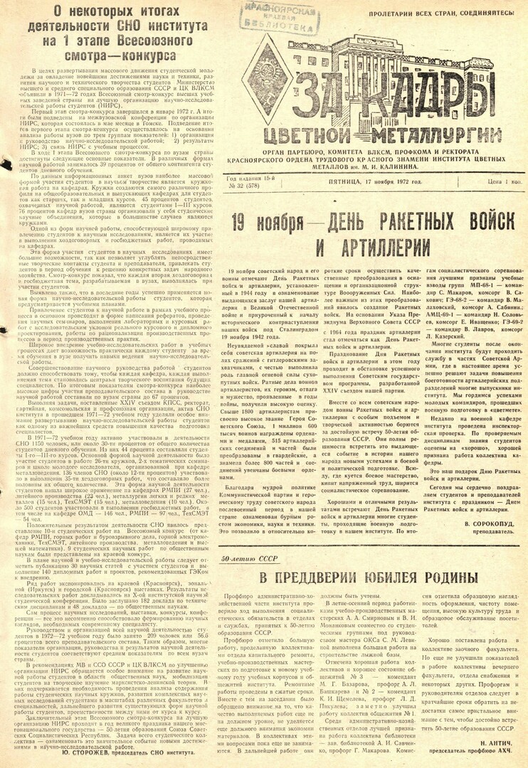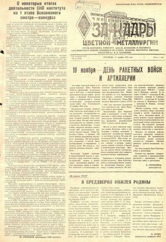 За кадры цветной металлургии : газета. 1972 г. № 32 (578) (17 ноября)выпуск журнала/газеты