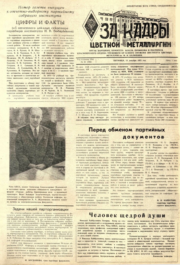 - Цифры и факты (из отчетного доклада секретаря партбюро института И. В. Бобарыкина). — С. 1.