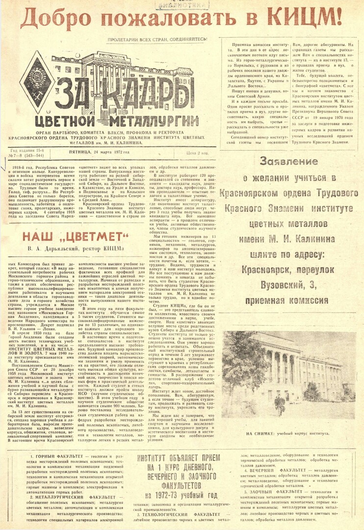За кадры цветной металлургии : газета. 1972 г. № 7/8 (543-544) (24 марта)выпуск журнала/газеты
