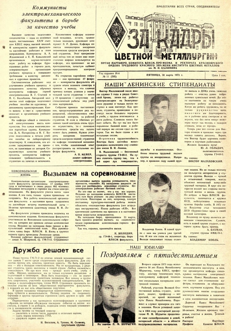 За кадры цветной металлургии : газета. 1973 г. № 11 (595) (30 марта)выпуск журнала/газеты