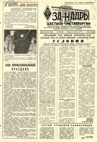 За кадры цветной металлургии : газета. 1973 г. № 25 (609) (24 августа)выпуск журнала/газеты