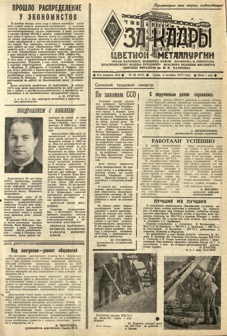 - Поздравляем с юбилеем! : [50 лет зав. кафедрой неорганической и аналитической химии - Ивашенцеву Я. И. : фото к заметке]. — С. 1.