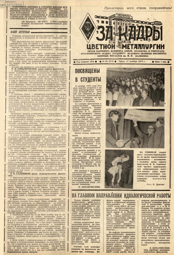 За кадры цветной металлургии : газета. 1973 г. № 30 (614) (17 октября)выпуск журнала/газеты