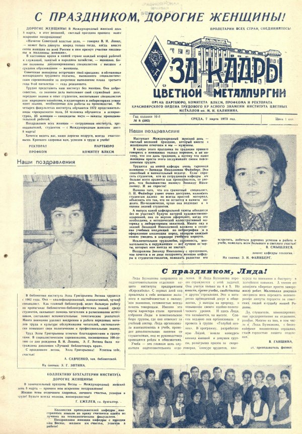 - С праздником, дорогие женщины! : [поздравление с Международным женским днем от ректората, партбюро, профкома, комитета ВЛКСМ]. — С. 1.
