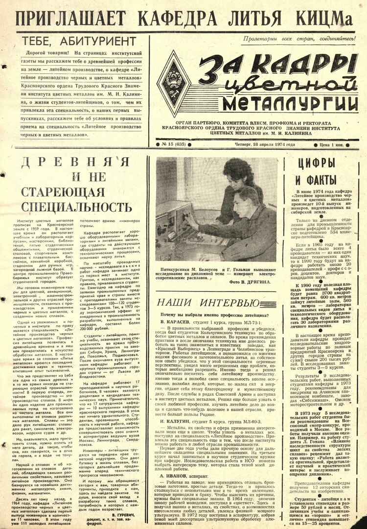 - Древняя и не стареющая специальность : [о специальности и кафедре "Литейное производство черных и цветных металлов"]. — С. 1.