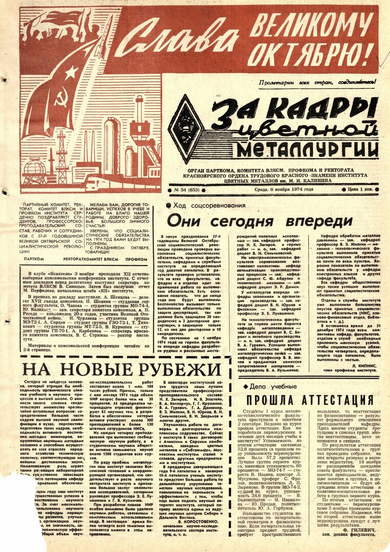 За кадры цветной металлургии : газета. 1974 г. № 34 (653) (6 ноября)выпуск журнала/газеты
