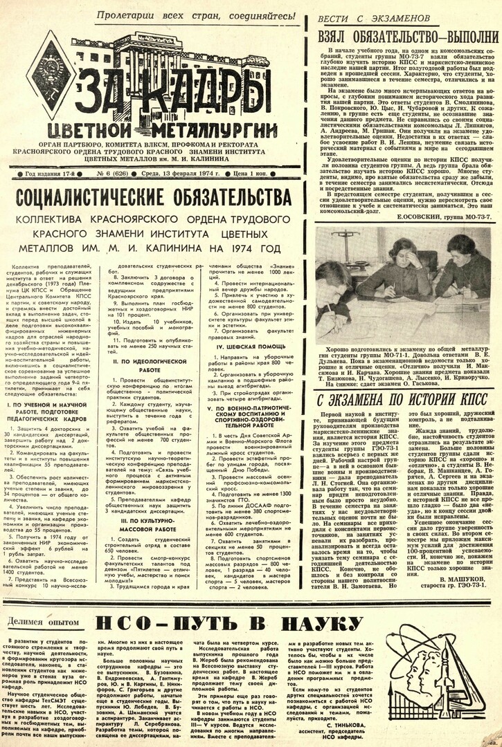 За кадры цветной металлургии : газета. 1974 г. № 6 (626) (13 февраля)выпуск журнала/газеты