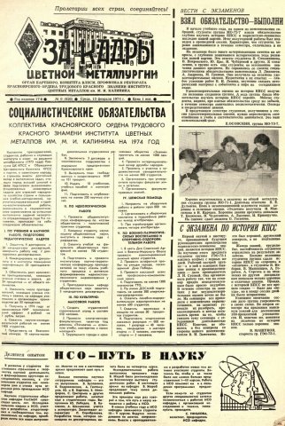 - Социалистические обязательства коллектива Красноярского ордена Трудового Красного Знамени института цветных металлов имени М. И. Калинина на 1974 год. — С. 1.