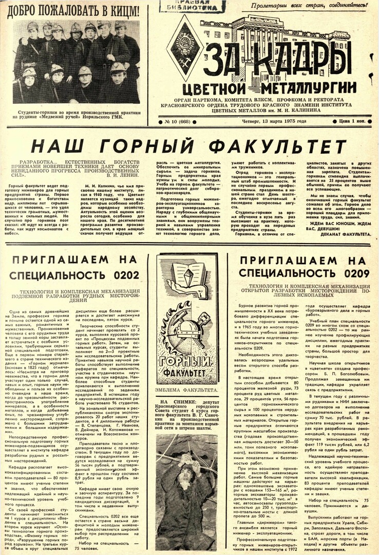За кадры цветной металлургии : газета. 1975 г. № 10 (668) (13 марта)выпуск журнала/газеты