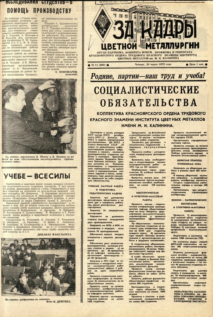 - Социалистические обязательства коллектива Красноярского ордена Трудового Красного Знамени инстиута цветных металлов имени М. И. Калинина : [обязательства рассмотрены и приняты на общем собрании преподавателей, студентов и сотрудников института]. — С. 1.