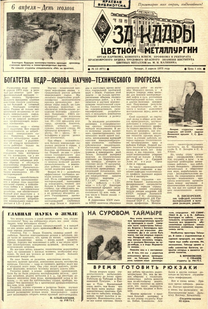 За кадры цветной металлургии : газета. 1975 г. № 13 (671) (3 апреля)выпуск журнала/газеты