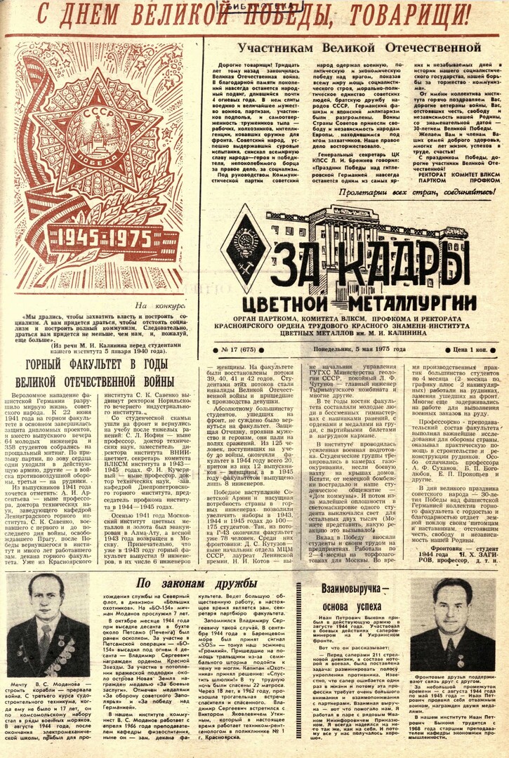 За кадры цветной металлургии : газета. 1975 г. № 17 (675) (5 мая)выпуск журнала/газеты
