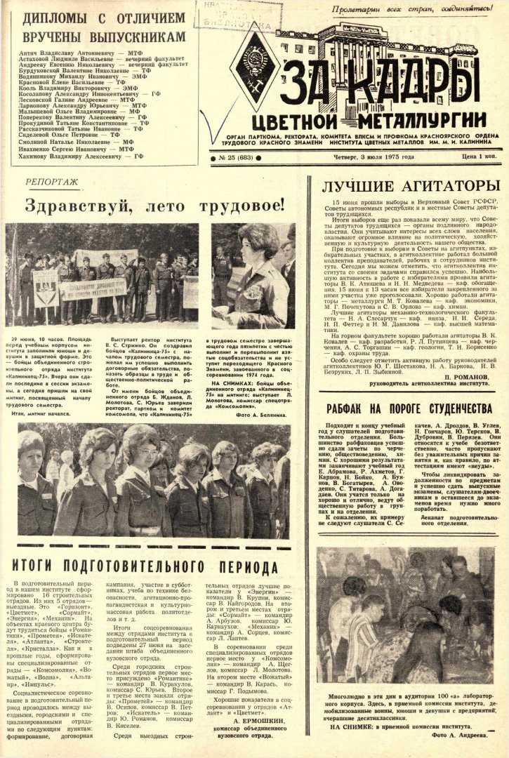 За кадры цветной металлургии : газета. 1975 г. № 25 (683) (3 июля)выпуск журнала/газеты