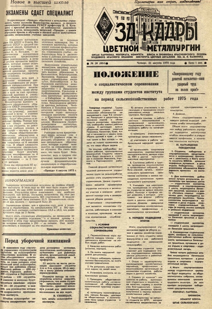 За кадры цветной металлургии : газета. 1975 г. № 26 (684) (21 августа)выпуск журнала/газеты