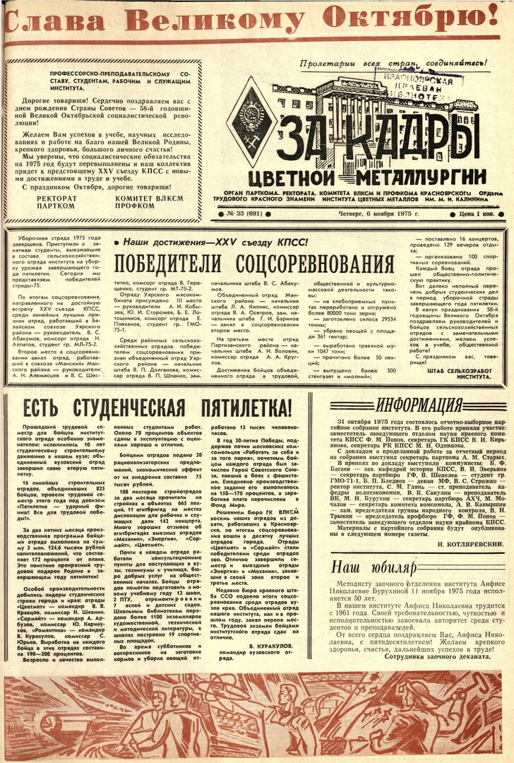 За кадры цветной металлургии : газета. 1975 г. № 33 (691) (6 ноября)выпуск журнала/газеты
