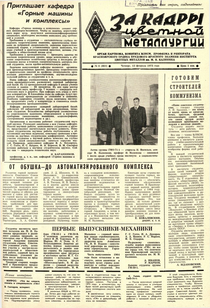 - Инженер-механик - творец новых машин : [подготовка горного инженера-механика для горнодобывающей промышленности]. — С. 2.