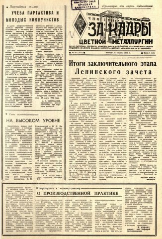 За кадры цветной металлургии : газета. 1976 г. № 10 (702) (11 марта)выпуск журнала/газеты
