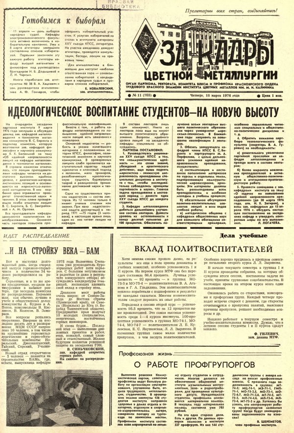 За кадры цветной металлургии : газета. 1976 г. № 11 (703) (18 марта)выпуск журнала/газеты