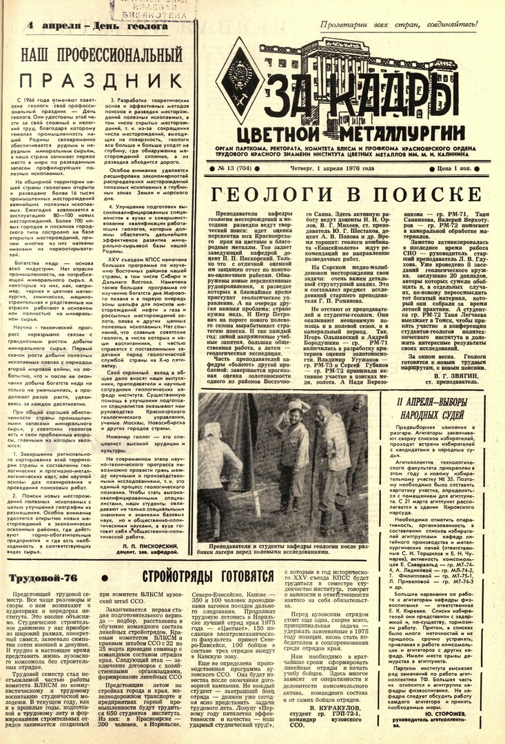 За кадры цветной металлургии : газета. 1976 г. № 13 (704) (1 апреля)выпуск журнала/газеты