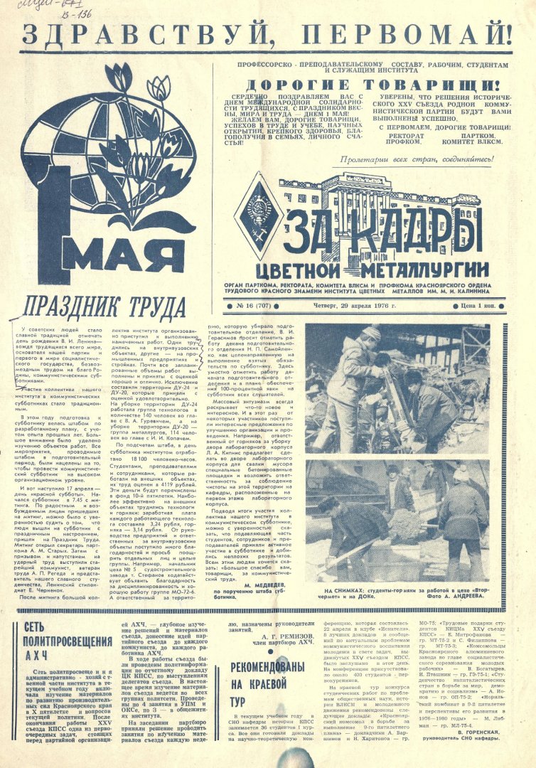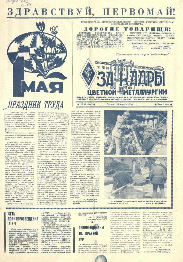 За кадры цветной металлургии : газета. 1976 г. № 16 (707) (29 апреля)выпуск журнала/газеты