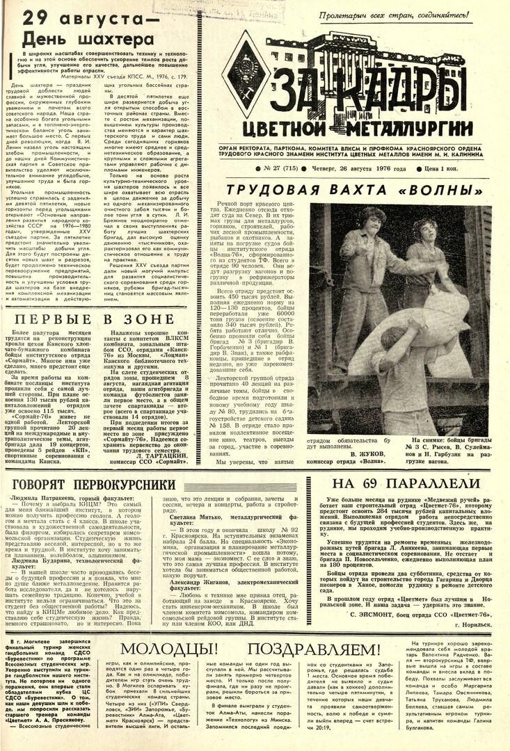 За кадры цветной металлургии : газета. 1976 г. № 27 (715) (26 августа)выпуск журнала/газеты