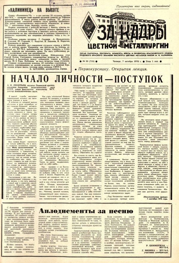 - Начало личности - поступок : [открытая лекция для первокурсника из газеты "Комсомольская правда" за 1 сентября 1976 года]. — С. 1.А. Н. Леонтьев