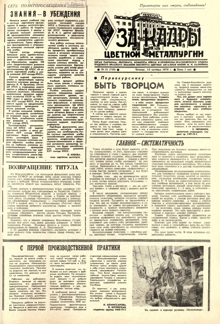 За кадры цветной металлургии : газета. 1976 г. № 31 (719) (14 октября)выпуск журнала/газеты