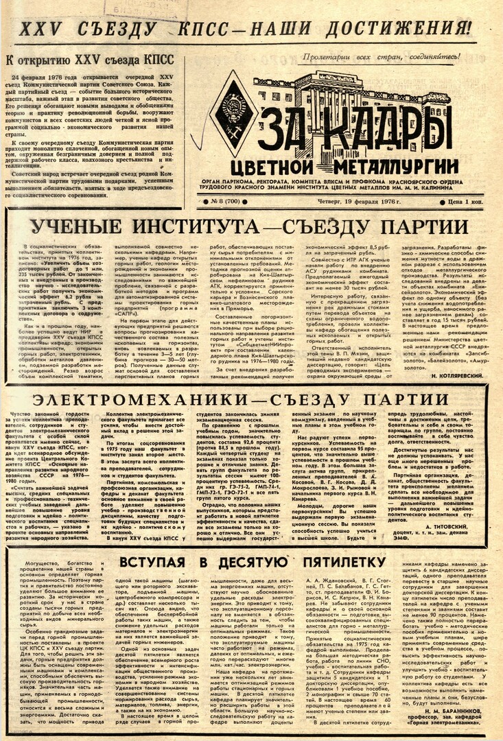 - Электромеханики - съезду партии : [результаты работы коллектива преподавателей, сотрудников и студентов на ЭФ]. — С. 1.