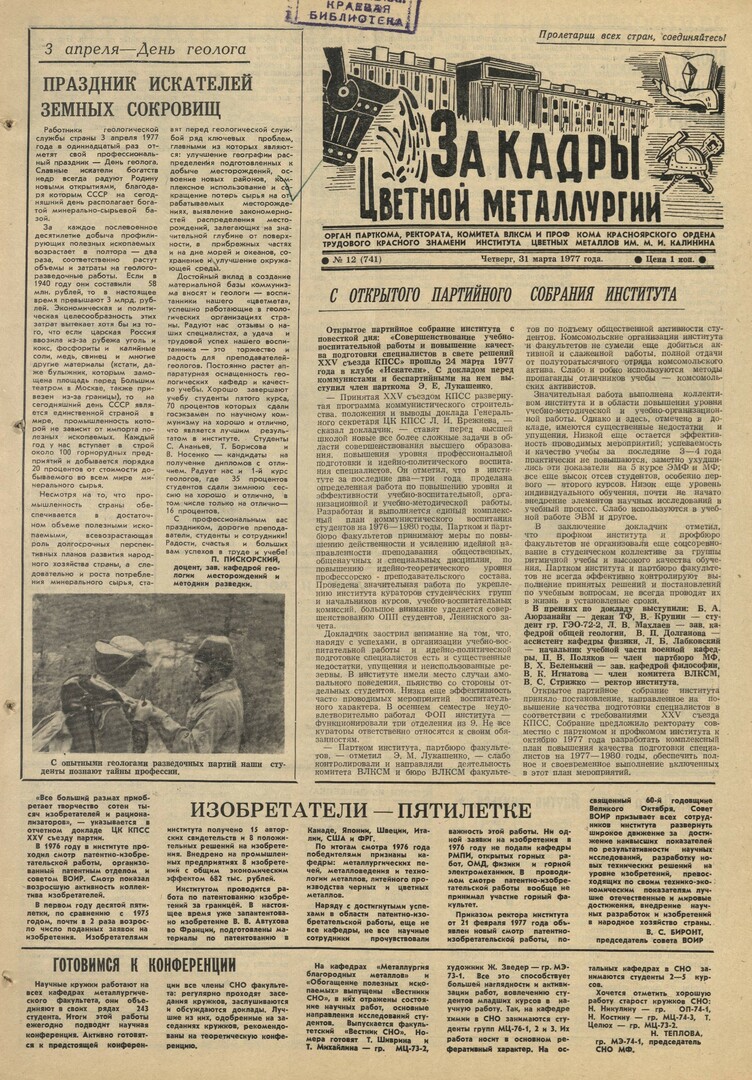 За кадры цветной металлургии : газета. 1977 г. № 12 (741) (31 марта)выпуск журнала/газеты