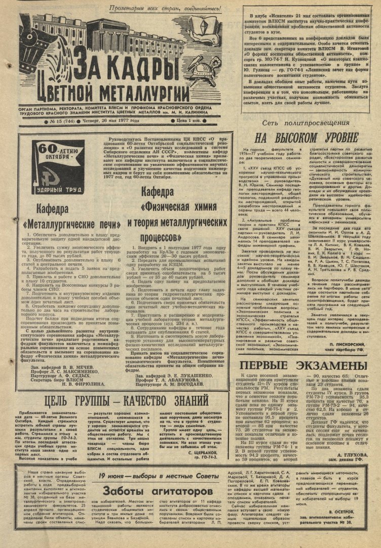 За кадры цветной металлургии : газета. 1977 г. № 15 (744) (26 мая)выпуск журнала/газеты