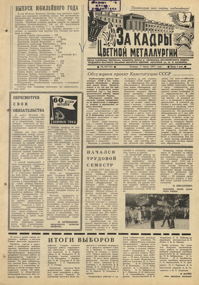 - Начался трудовой семестр : [митинг объединенного вузовского ССО "Калининец-77" (29 июня)]. — С. 1.