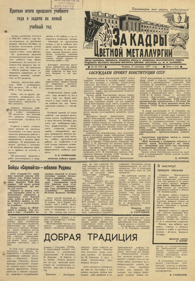 - Обсуждаем проект Конституции СССР : [коллектив института одобряет новый проект Конституции]. — С. 1.