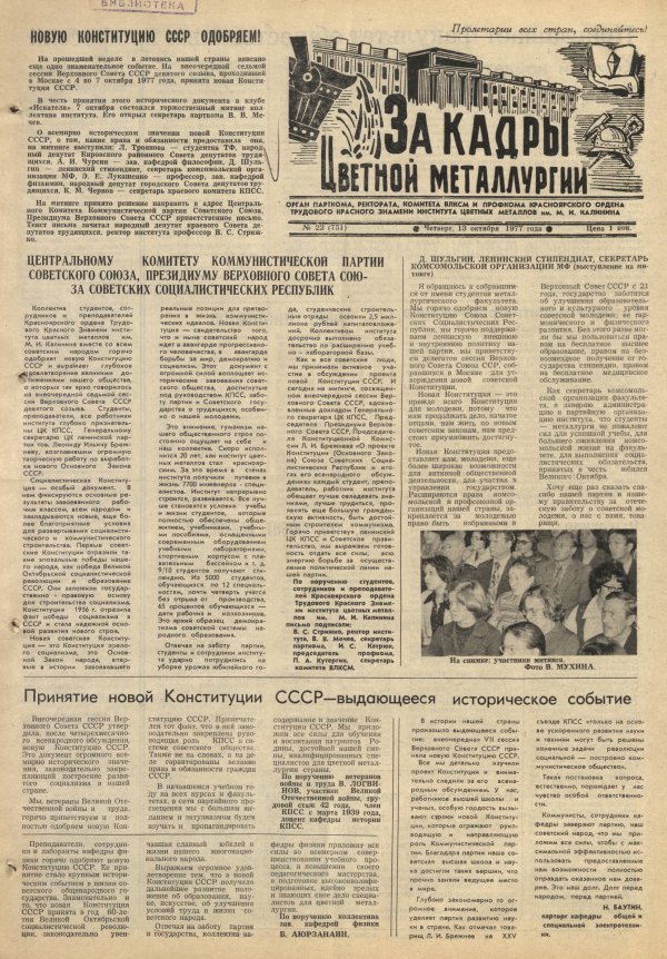 - Принятие новой Конституции СССР - выдающееся историческое событие : [ветераны Великой Отечественной войны и труда института приветствуют и одобряют конституцию]. — С. 1.