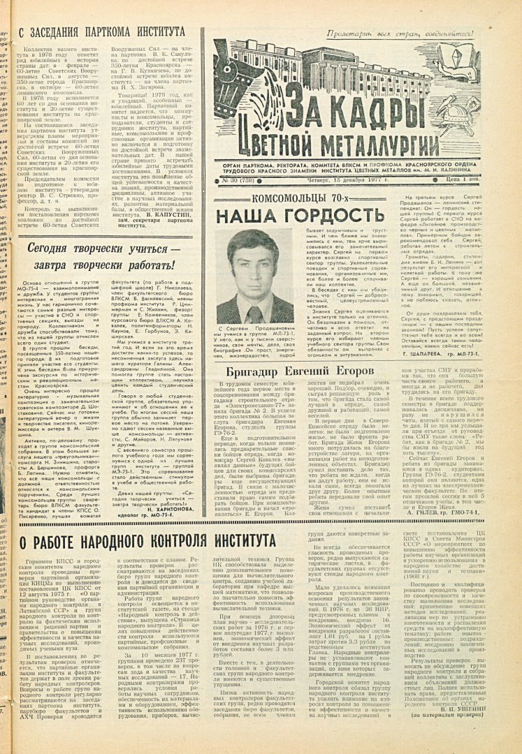 За кадры цветной металлургии : газета. 1977 г. № 30 (759) (15 декабря)выпуск журнала/газеты