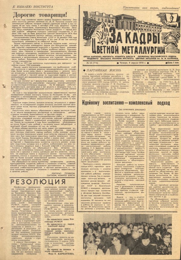 За кадры цветной металлургии : газета. 1978 г. № 13 (774) (6 апреля)выпуск журнала/газеты
