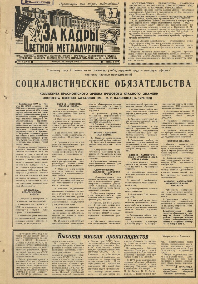 - Социалистические обязательства коллектива Красноярского Ордена Трудового Красного Знамени института цветных металлов им. М. И. Калинина на 1978 год. — С. 1.