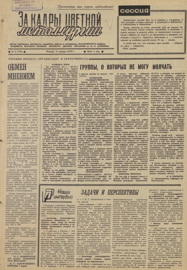 За кадры цветной металлургии : газета. 1979 г. № 2 (795) (11 января)выпуск журнала/газеты