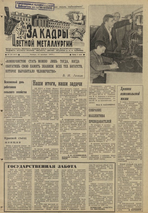 За кадры цветной металлургии : газета. 1979 г. № 24 (817) (11 октября)выпуск журнала/газеты