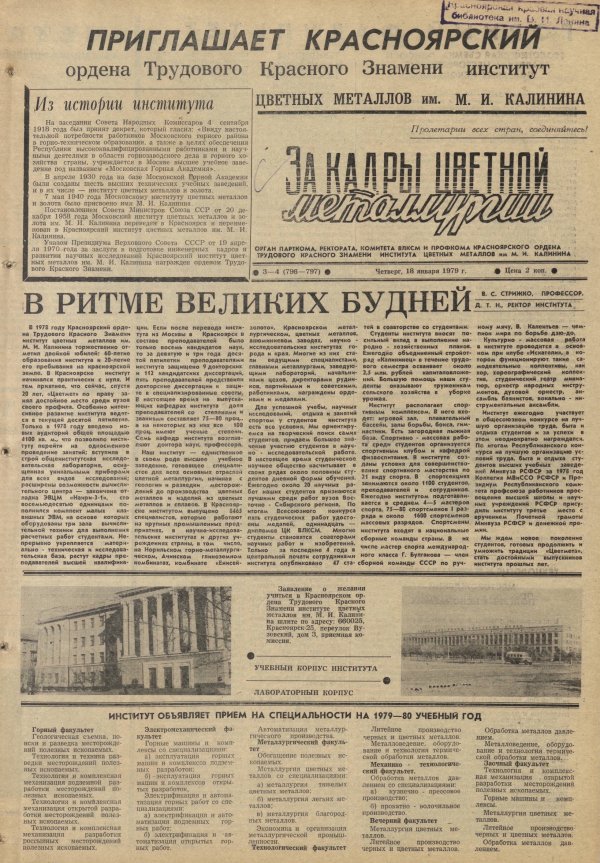 За кадры цветной металлургии : газета. 1979 г. № 3/4 (796-797) (18 января)выпуск журнала/газеты