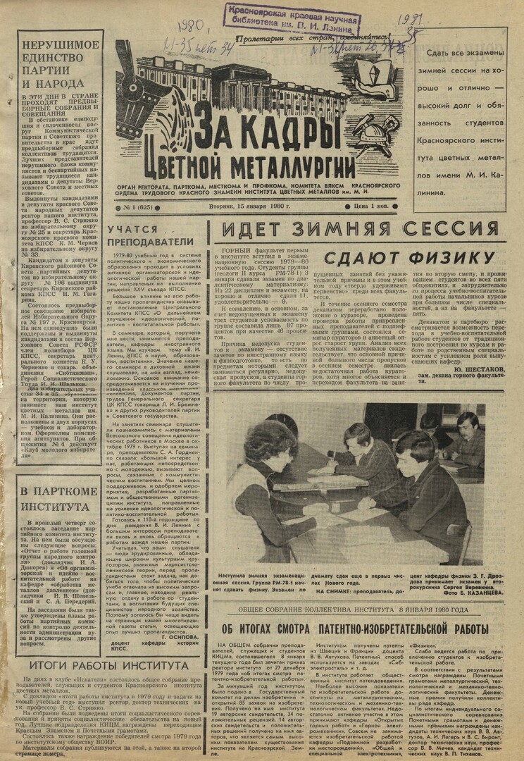- Социалистические обязательства коллектива Красноярского Ордена Трудового Красного Знамени института цветных металлов им. М. И. Калинина на 1980 год : [приняты на общем собрании института 8 января 1980 года]. — С. 2.