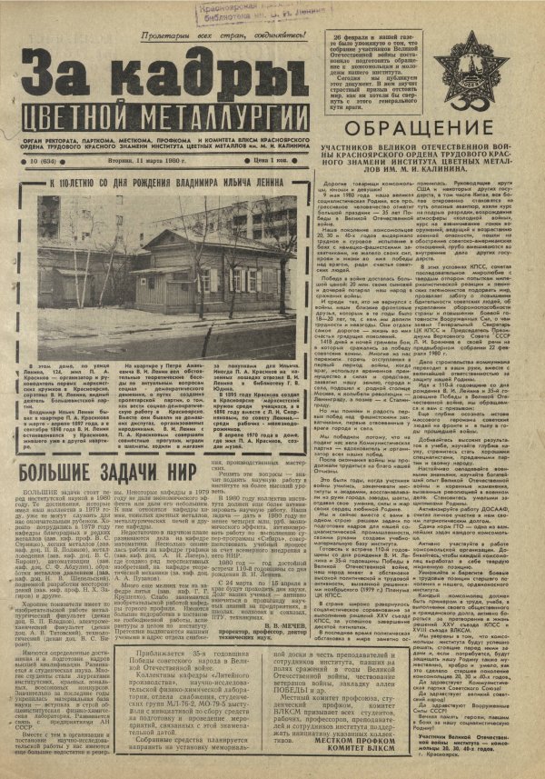- Обращение участников Великой Отечественной войны Красноярского Ордена Трудового Красного Знамени института цветных металлов им. М. И. Калинина. — С. 1.
