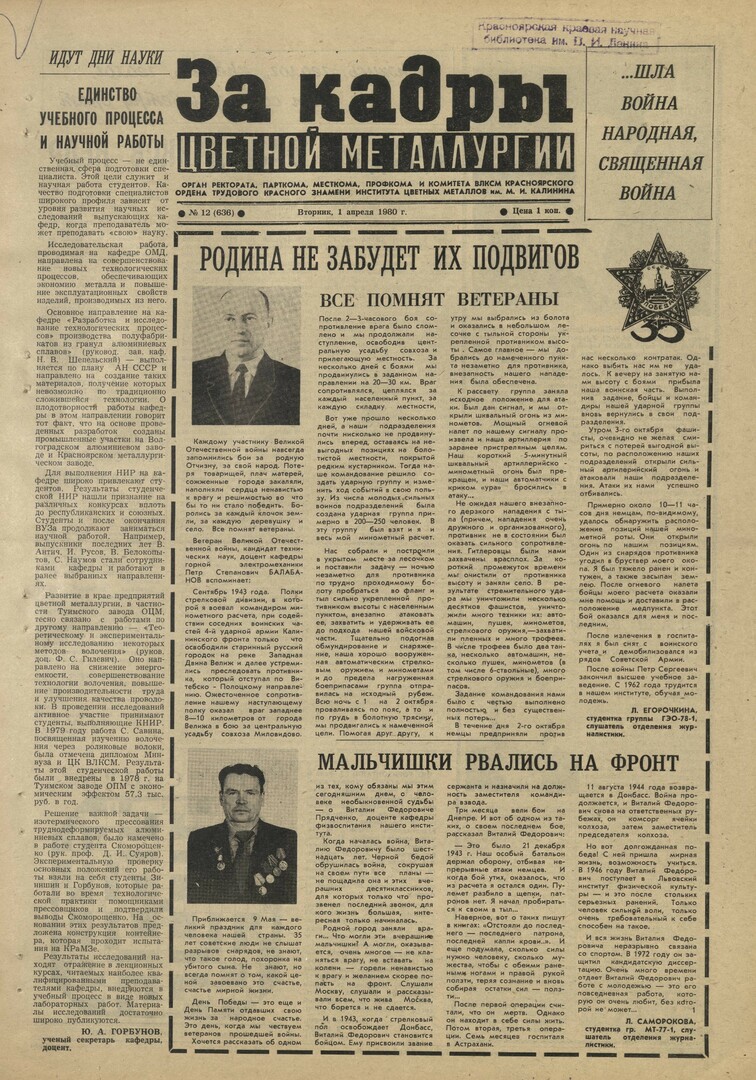 - Родина не забудет их подвигов. Мальчишки рвались на фронт : [фронтовой путь доцента кафедры физвоспитания В. Ф. Прядченко]. — С. 1.