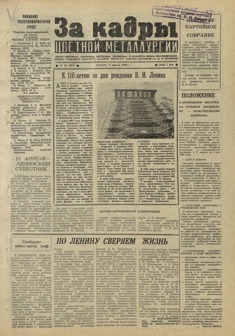 - По Ленину сверяем жизнь : [открытое партсобрание электромеханического факультета]. — С. 1.
