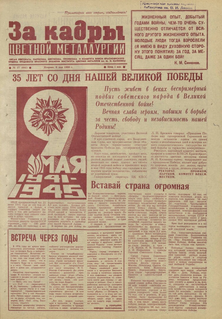 - 35 лет со дня нашей великой Победы : [поздравление с праздником Победы от ректората, парткома, профкома, комитета ВЛКСМ, месткома]. — С. 1.
