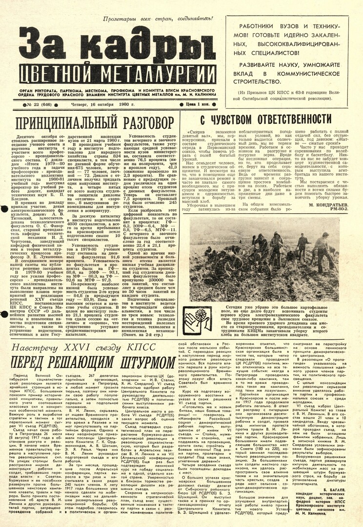 - Принципиальный разговор : [обсуждение доклада "Итоги 1979-80 учебного года и задачи профессорско-преподавательского коллектива института на 1980-81 учебный год" на расширенном заседании ученого совета (10 октября)]. — С. 1,2.