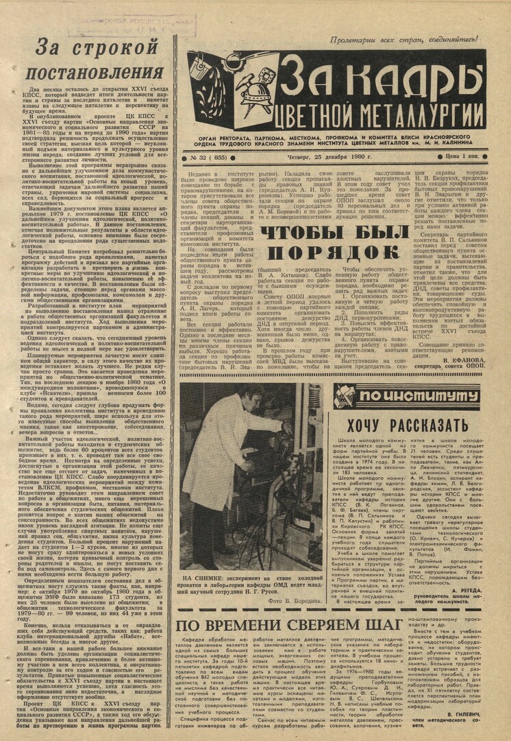 За кадры цветной металлургии : газета. 1980 г. № 32 (855) (25 декабря)выпуск журнала/газеты