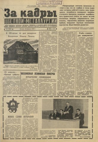 За кадры цветной металлургии : газета. 1980 г. № 8 (632) (26 февраля)выпуск журнала/газеты